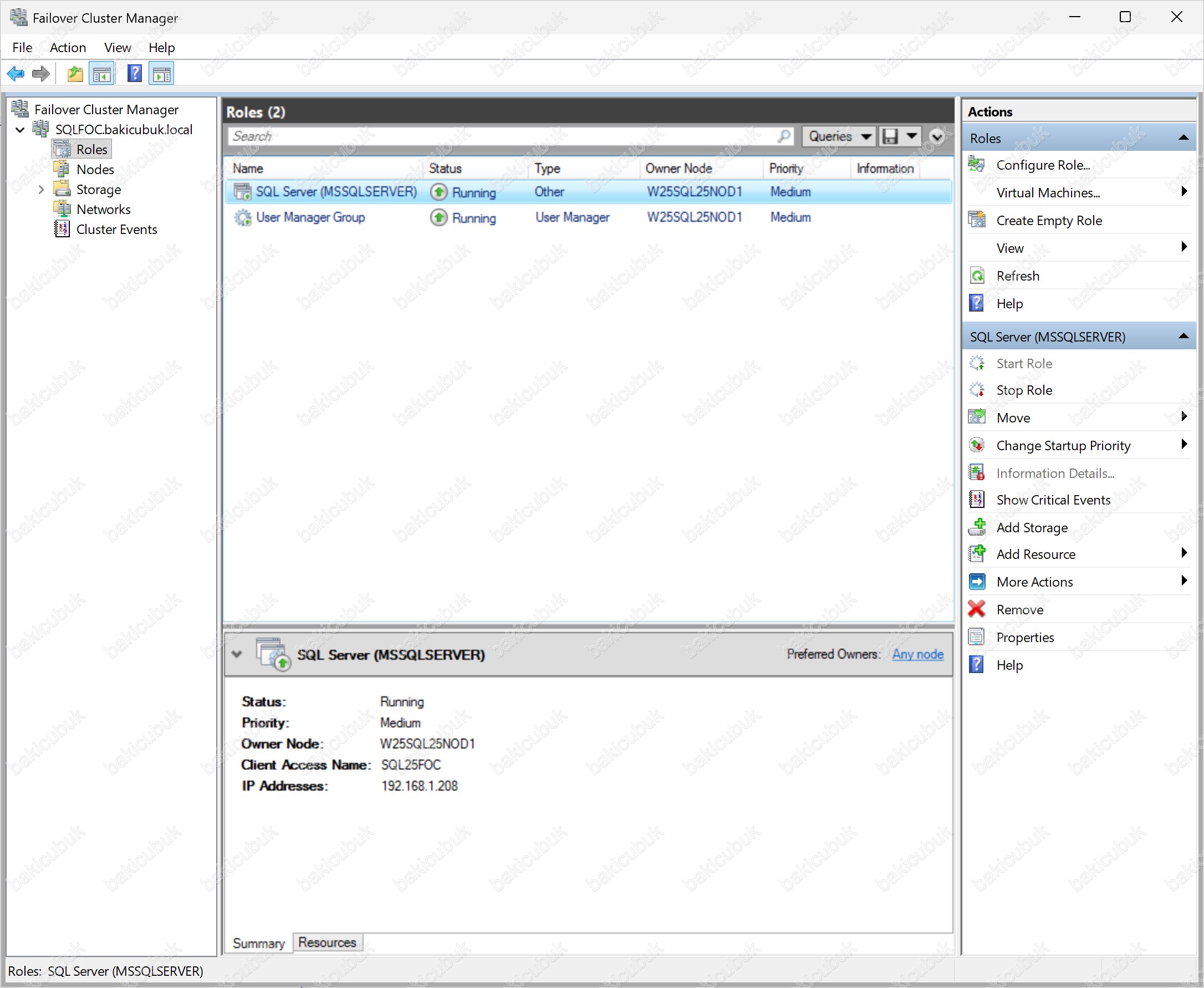 W25SQL25NOD1 isimli sunucumuz üzerinde Failover Cluster Manager konsolunu açıyoruz.