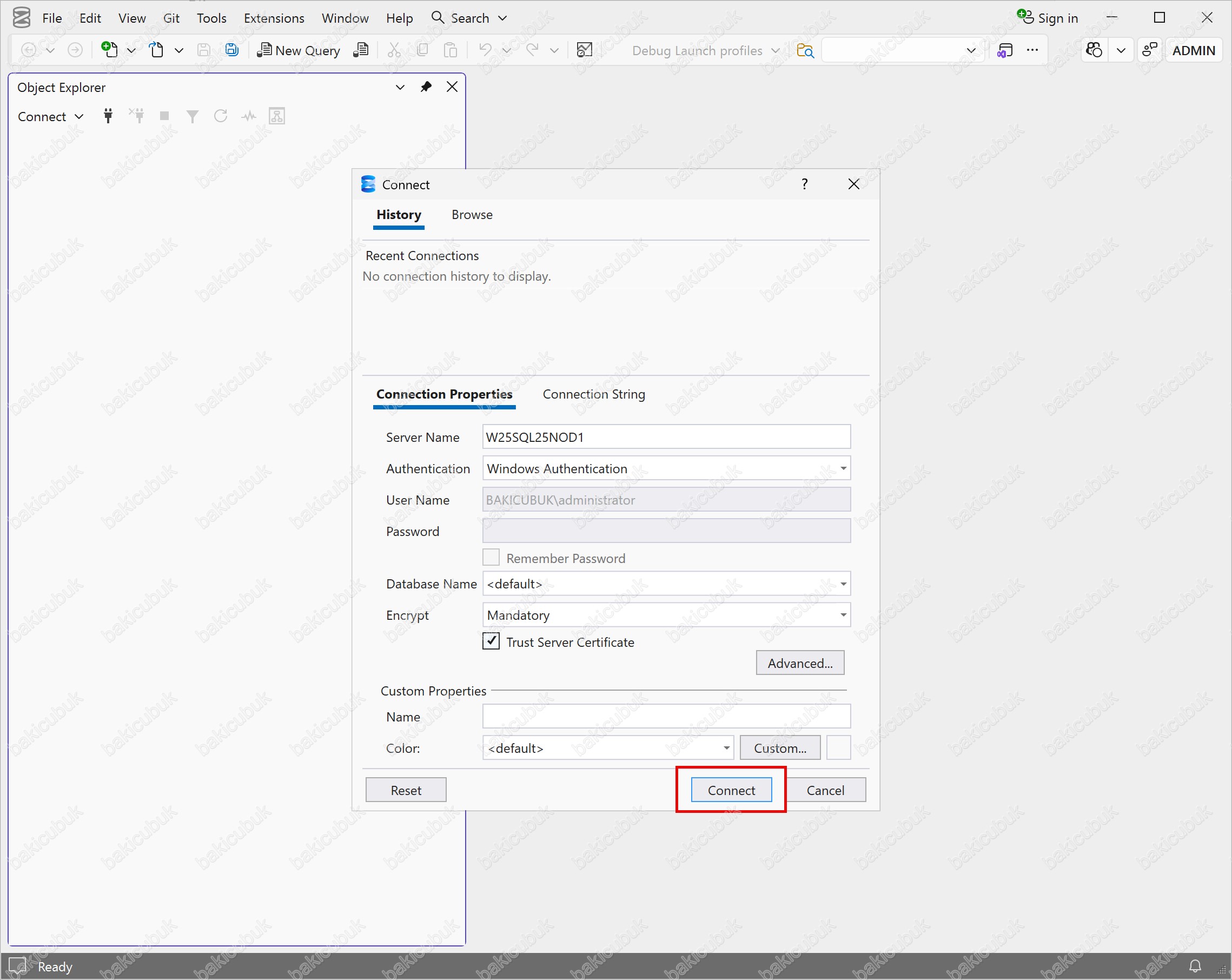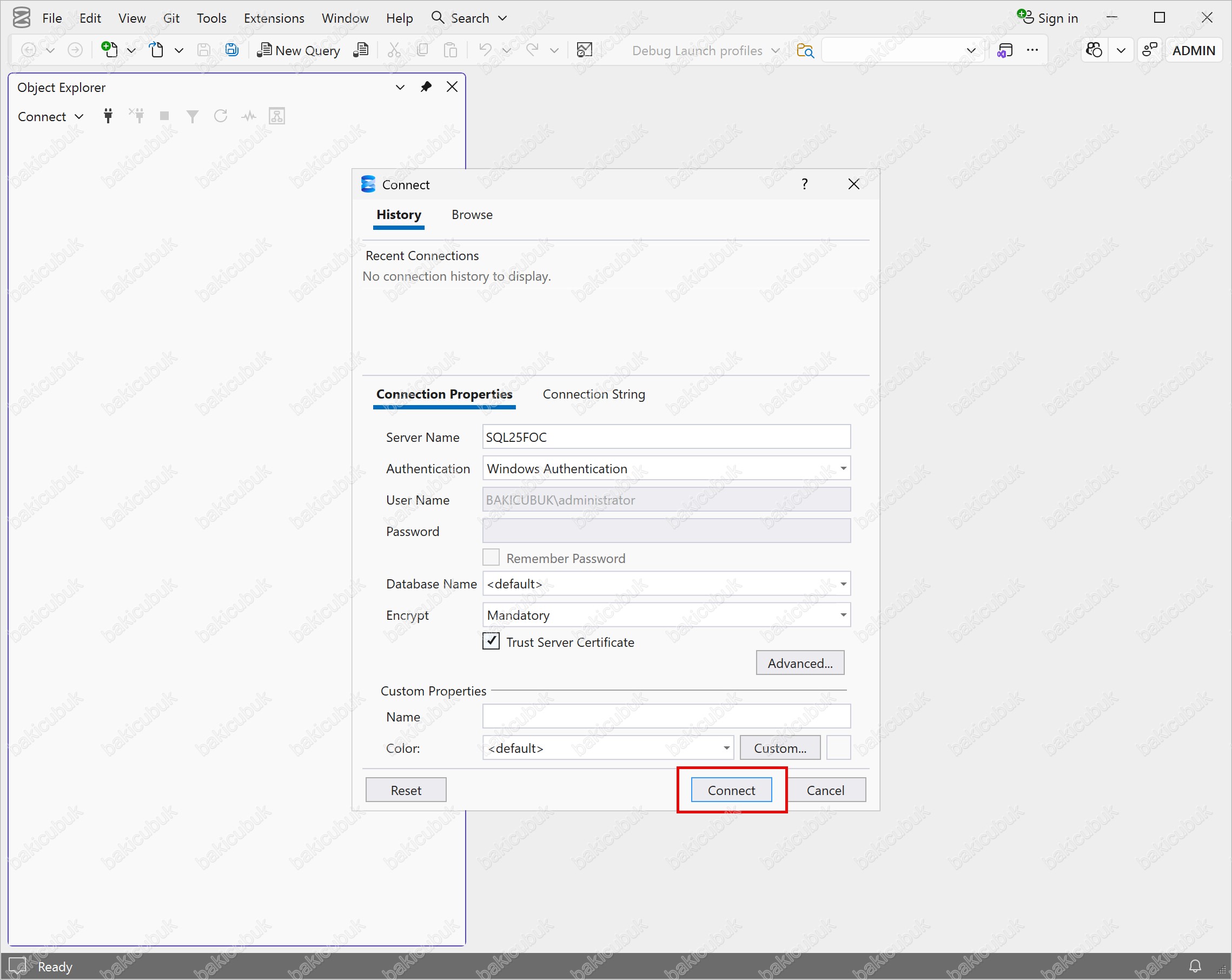 Gerekli yapılandırmaları tamamladıktan sonra Connect seçeneğine tıklayarak SQL25FOC isimli Microsoft SQL Server 2025 Failover Cluster Instance (FCI) yapısına bağlantı sağlıyoruz.