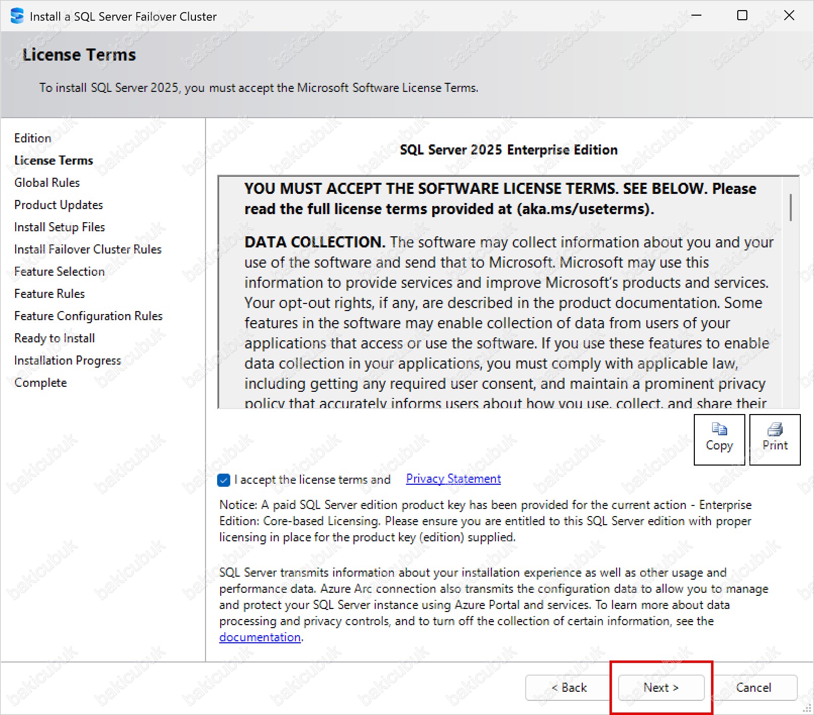 License Terms ekranında lisans koşullarını onayladıktan sonra Next seçeneğine tıklayarak Microsoft SQL Server 2025 kurulumunun bir sonraki aşamasına geçiyoruz.