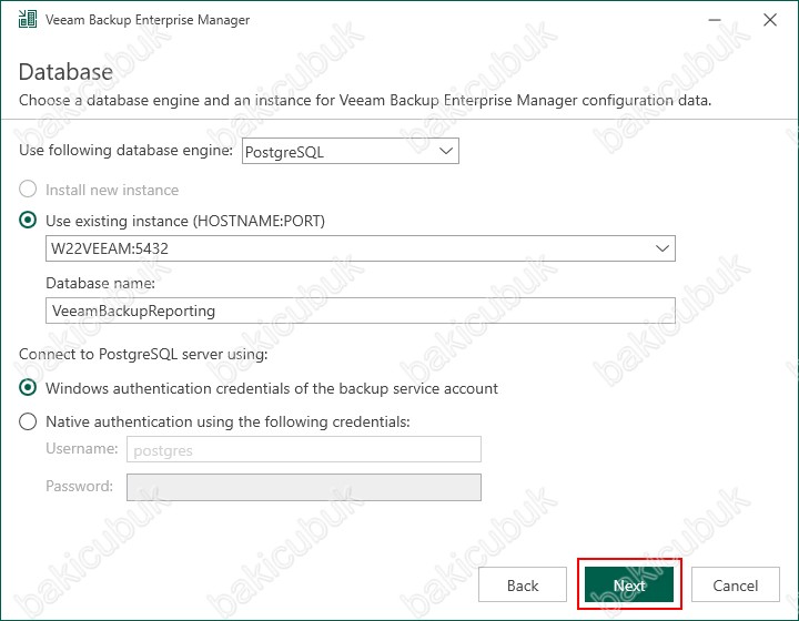 Windows authentication credentials of the backup service account seçeneği ile PostgreSQL 15.1 kurulumunu Veeam Backup & Replication 12 kurulumunu yapacağınız sunucunuz üzerinde yaparak bağlantısını Windows hesabı ile yapılandırabilirsiniz. Ortamınız da farklı bir sunucu üzerinde bulunan PostgreSQL 15.1 veritabanı sunucusuna bağlantısını Windows hesabı ile sağlayabilirsiniz.