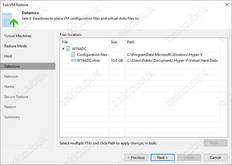 Datastore ekranın da Restore ( Geri Yükleme ) işlemini Hyper-V default olarak belirlediği dizin üzerine Restore ( Geri Yükleme ) yapılacağını görüyoruz. Microsoft Hyper-V Server ( Standalone ) sunucumuz üzerinde bu dizini kullanıyorsanız bu şekilde bırakabilirsiniz ya da Microsoft Hyper-V Server ( Standalone ) üzerindeki belirlediğiniz bir dizini gösterebilirsiniz. Ancak Microsoft Hyper-V Failover Cluster yapısında Cluster Volume göstermeniz gerekmektedir.