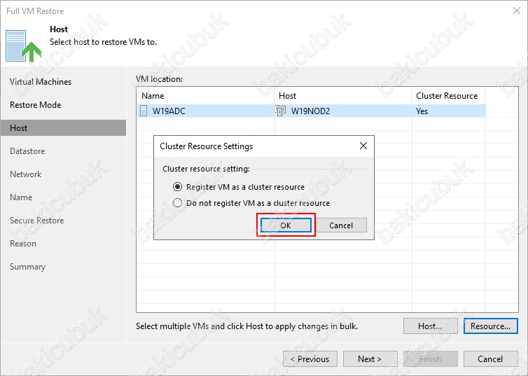 - Register VM as a cluster resource : Microsoft Hyper-V Failover Cluster yapısını üzerinde dahil edebilirsiniz. Eğer bu seçeneği seçmezseniz Restore ( Geri Yükleme ) işleminden sonra Virtual Machine ( Sanal Makine ) sadece Hyper-V Manager konsolunda görünecektir. Sonrasında Microsoft Hyper-V Failover Cluster yapısına siz dahil edebilirsiniz.