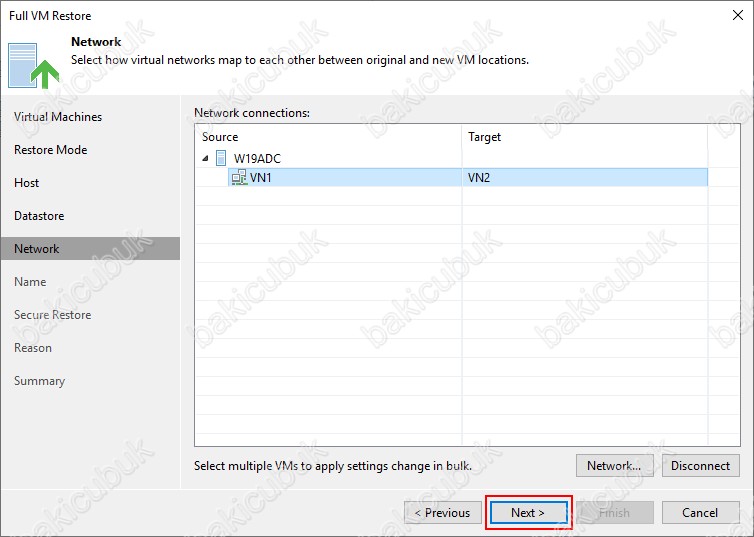 Network ekranın da Restore ( Geri Yükleme ) işlemini ortamımızdaki Microsoft Hyper-V Server ( Standalone ) sunucumuz ya da Microsoft Hyper-V Failover Cluster yapısında bulunan NOD’larınız üzerindeki hangi Virtual Network Switch ( Sanal Network ) üzerine Restore ( Geri Yükleme ) işlemi yapıldıktan sonra Network ile haberleşmesini sağlamasını yapılandırdığımız ekrandır. Backup ( Yedek ) alındığında hangi Virtual Network Switch ( Sanal Network ) kullanıyorsa herhangi bir yapılandırma yapmazsaniz o Virtual Network Switch ( Sanal Network ) üzerinde yapılandırılacaktır.