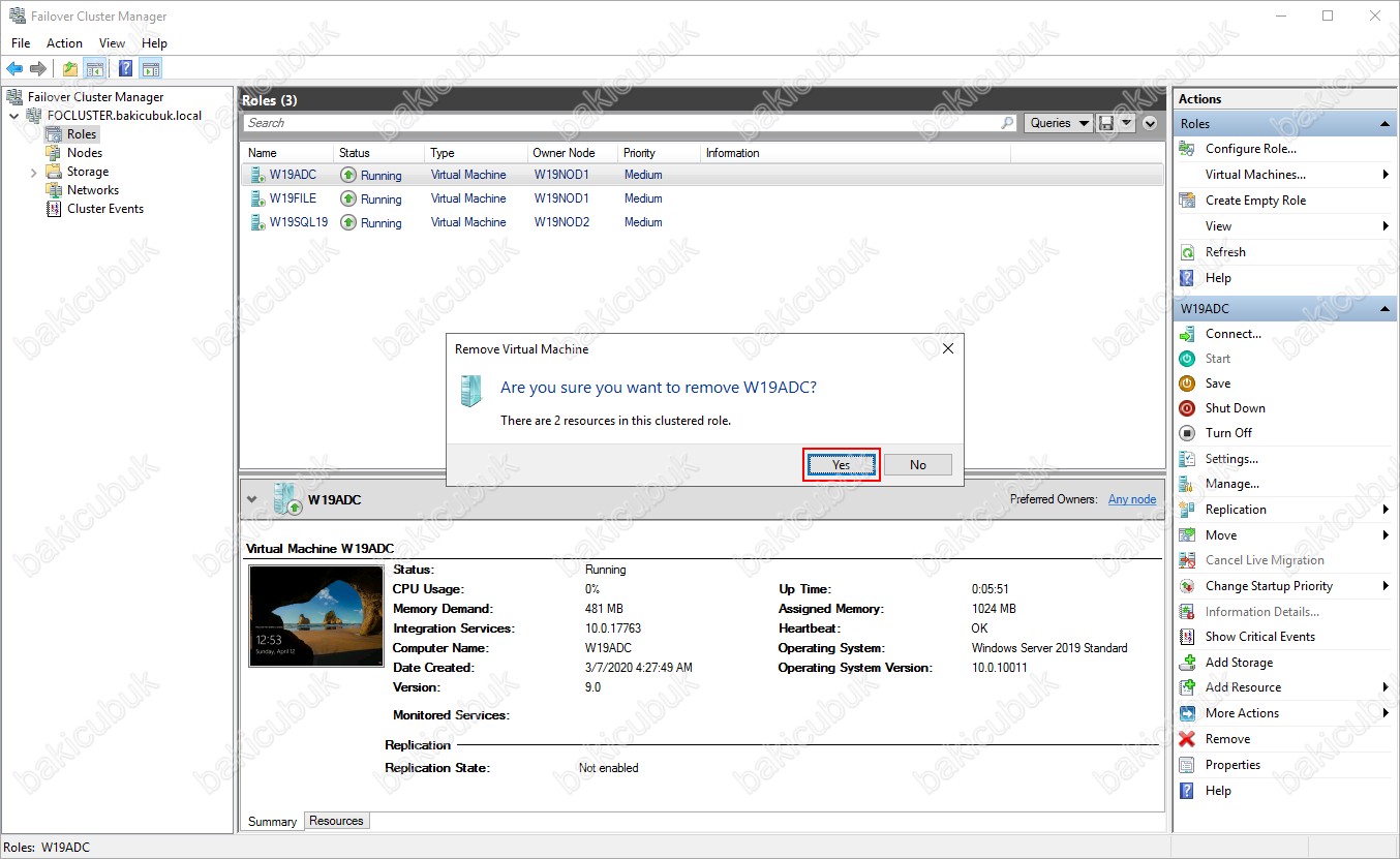 Failover Cluster Manager konsolu üzerinde bulunan W19ADC isimli Virtual Machine ( Sanal Makine ) sunucumuzu önce Failover Cluster Manager konsolu üzerinde siliyoruz.