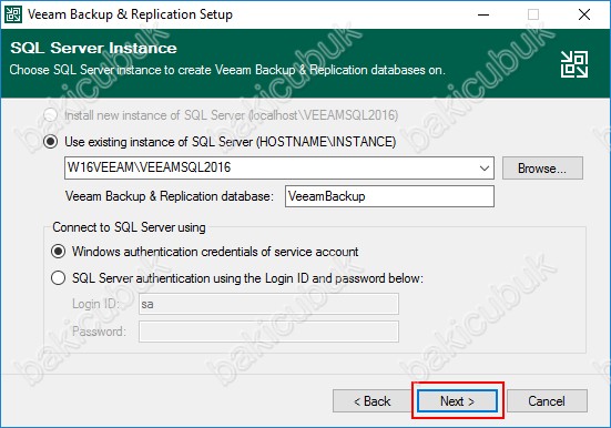 SQL Server Instance ekranın da Veeam Backup & Replication 10a kurulumunda Database ( Veritabanı ) yapısı için Microsoft SQL Server yapısını kullanmaktadır. Bu Database ( Veritabanı ) üzerinde Veeam Backup & Replication 10a üzerindeki yapılandırma ve raporlama bilgileri tutulmaktadır.
