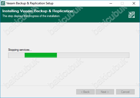 Installing Veeam Backup & Replication… ekranın da Veeam Backup & Replication 10a kurulum işlemi için servislerin Stopping services… olduğunu görüyoruz.