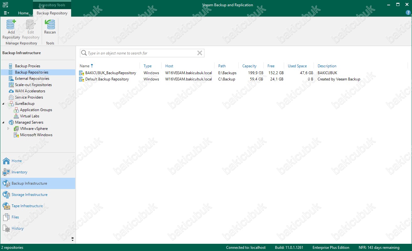 Veeam Backup & Replication 11 konsolun da bulunan Backup Infrastructure menüsü altında bulunan Backup Repositories sekmesine yapılandırmış olduğumuz BAKICUBUK_DDVE_BackupRepository isimli Dell EMC Data Domain Virtual Edition geldiğini görüyoruz.