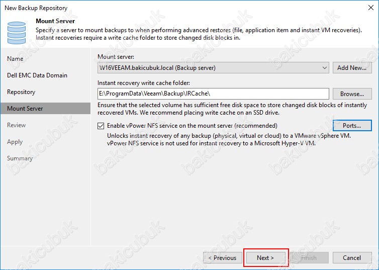 Enable vPower NFS service on the mount server (recommended) bölümünde ise Veeam firmasına patentli bir teknolojisi olan vPower NFS özelliğini aktif edebiliyoruz.