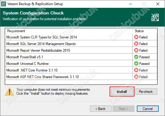 System Configuration Check ekranın da Veeam Backup & Replication 11 kurulumu için gerekli olan yazılımların Windows Server işletim sistemimiz üzerinde kurulması için Install diyoruz.