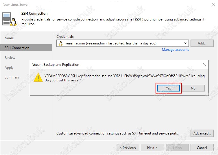 Veeam Backup and Replication ekranın da Ubuntu Server 23.10 sunucumuz üzerinde SSH Key bağlantı sağlaması için Yes diyerek kabul ediyoruz.