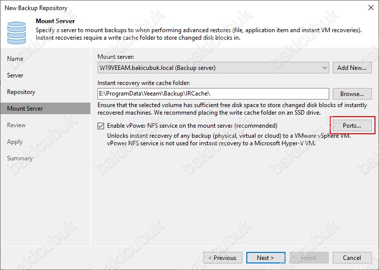 Mount Server ekranın da Enable vPower NFS service on the mount server (recommended) bölümünde bulunan Ports seçeneğine tıklıyoruz.