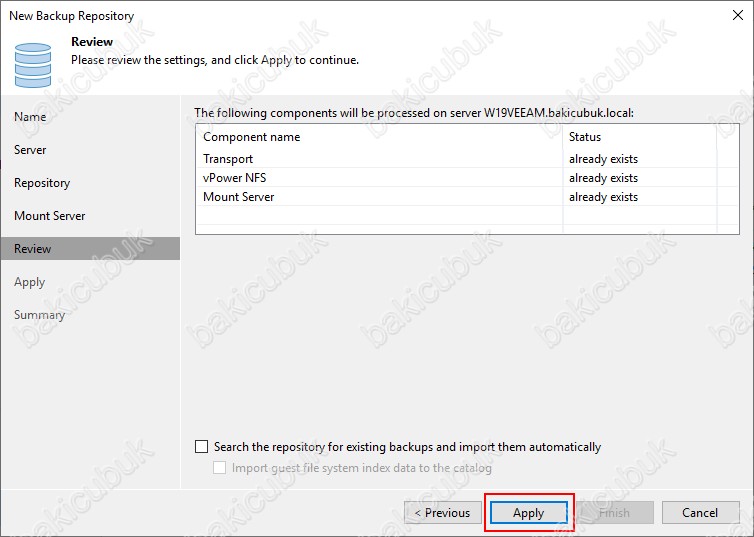 Review ekranın da Search the repository for existing backups and import them automatically seçeneğini işaretlererek yapılandıracağınız Hardened Repository (Immutability) içinde eğer daha önceden alınan Backup ( Yedek ) dosyaları varsa Import guest file system index data to the catoalog seçeneğini işaretleyerek Import edebilirsiniz.