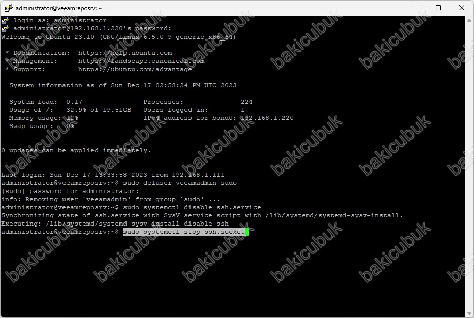 SSH servisi yalnızca Veeam Backup & Replication 12.1 üzerine eklediğimiz Ubuntu Server 23.10 sunucumuz için gerekli olduğundan, Hardened Repository (Immutability) güvenliğini sağlamak için SSH servisini devre dışı bırakarak SSH servisini durdurduk.