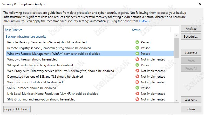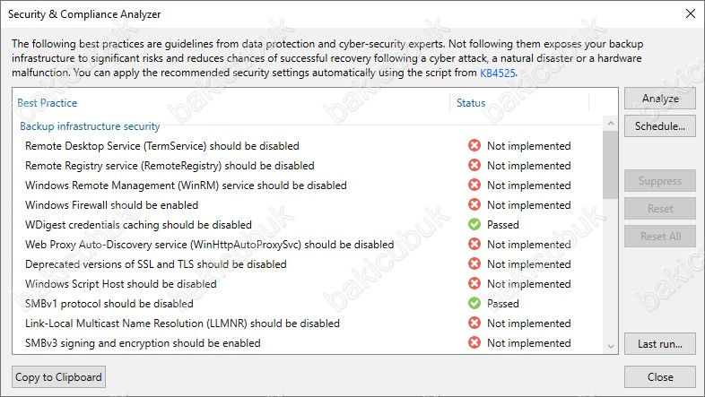 Veeam Backup & Replication 12.2 üzerinde gerekli Security & Compliance adımlarının analiz işleminin gerçekleştirildiğini görüyoruz.