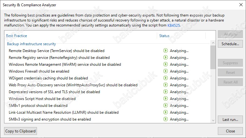 Security & Compliance Analyzer ekranın da Veeam Backup & Replication 12.2 üzerinde analiz işlemi tamamlanıyor.