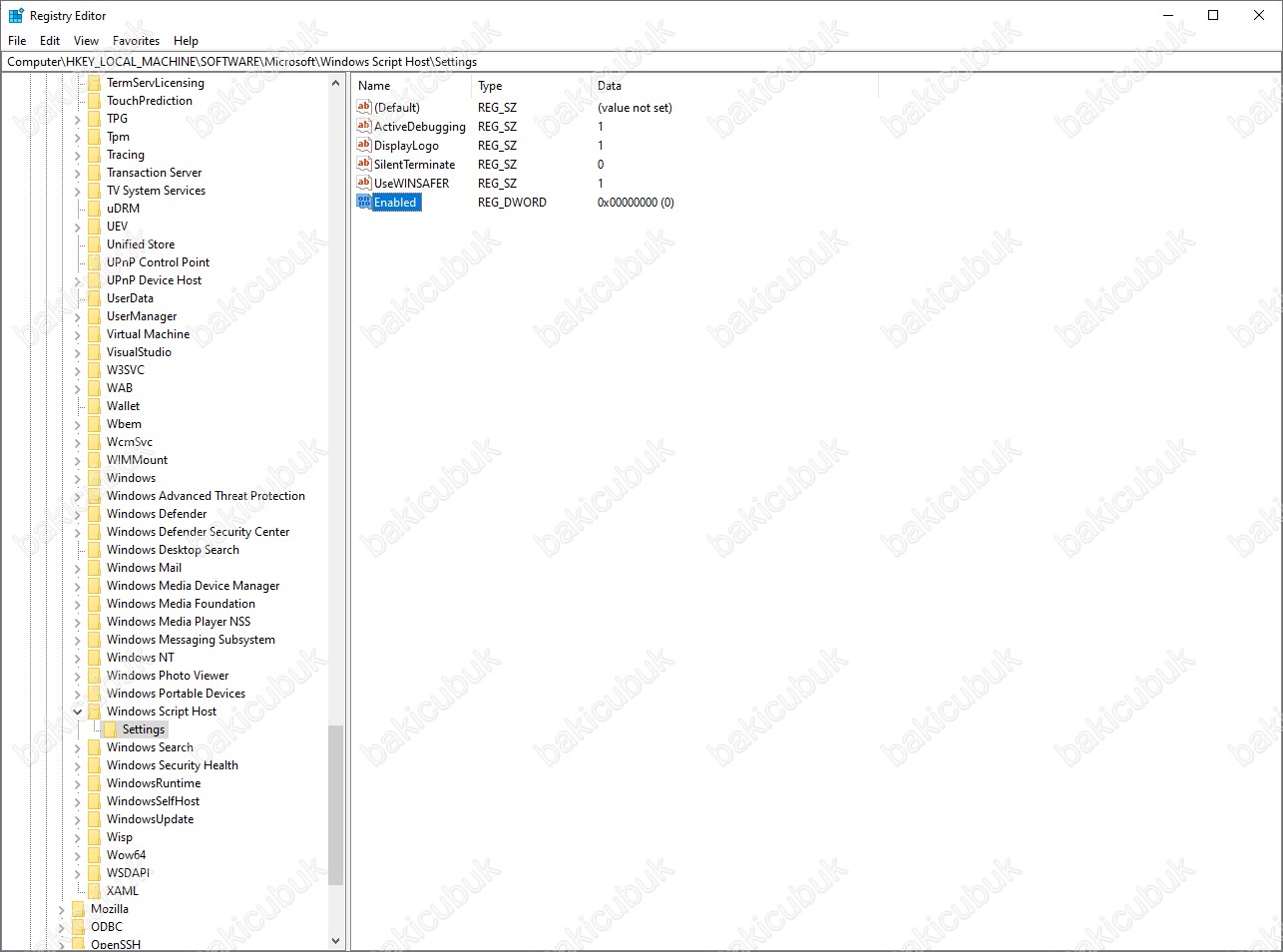 HKEY_LOCAL_MACHINE\SOFTWARE\Microsoft\Windows Script Host\Settings altında Enabled adında bir DWORD alt anahtarını oluşturuyoruz ve değerini 0 olarak yapılandırıyoruz.