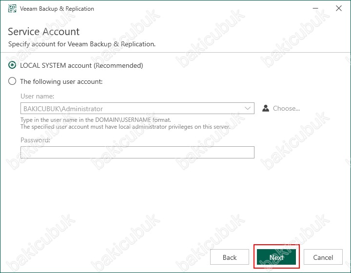 Service Account ekranın da Veeam Backup & Replication 12.2 servisleri için kullanılacak olan User ( Kullanıcı ) yapılandırabilirsiniz.