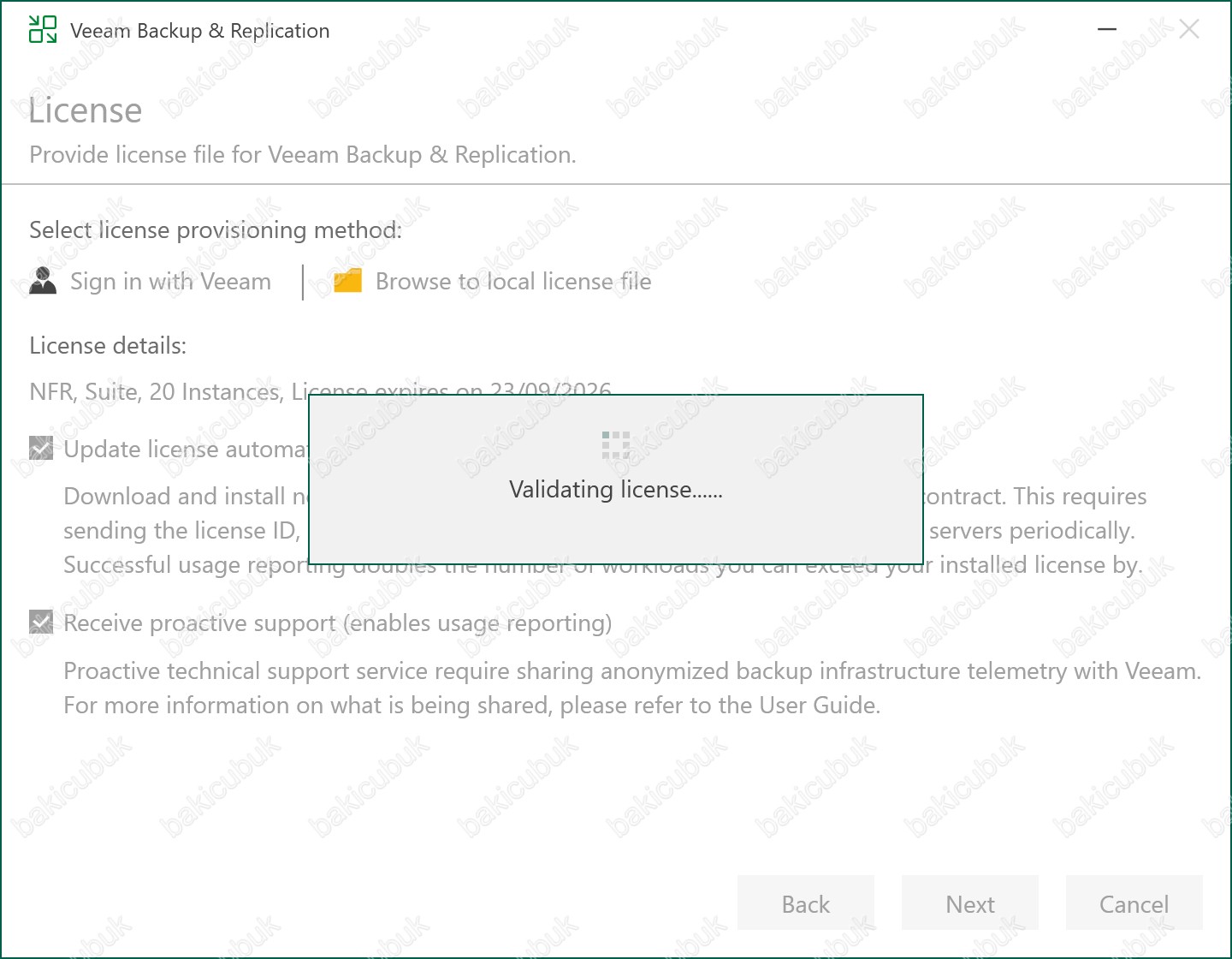 License ekranında Validating license ifadesini görüyoruz. Veeam’in mevcut lisans dosyasını doğrulama aşamasında olduğunu göstermektedir. Bu işlem sırasında lisansın geçerliliği, bakım süresi, edition uyumluluğu ve Veeam Enterprise Manager bağlantısı gibi noktalar kontrol edilir. Yeni kurulum, upgrade, lisans dosyası ekleme veya internet/proxy erişimi gibi durumlarda bu mesaj kısa süreli olarak görünmesi normaldir.
