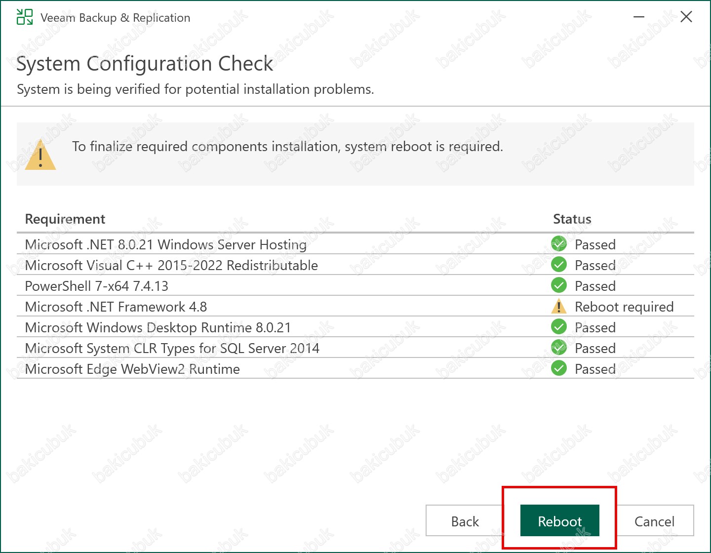To finalize required components installation, system reboot is required ifadesini görüyoruz. Bu Veeam Backup & Replication 13.0.1.1071 yükseltme işlemi için gerekli Microsoft .NET Framework 4.8 bileşeninin kurulumunun tamamlanabilmesi için sistemin yeniden başlatılması gerektiğini görüyoruz. Kurulum sırasında yüklenen bazı servisler ve bağımlılıklar ancak yeniden başlatma sonrası aktif hale gelir. Bu nedenle işlemin sağlıklı şekilde devam edebilmesi için sunucunun yeniden başlatılması zorunludur.