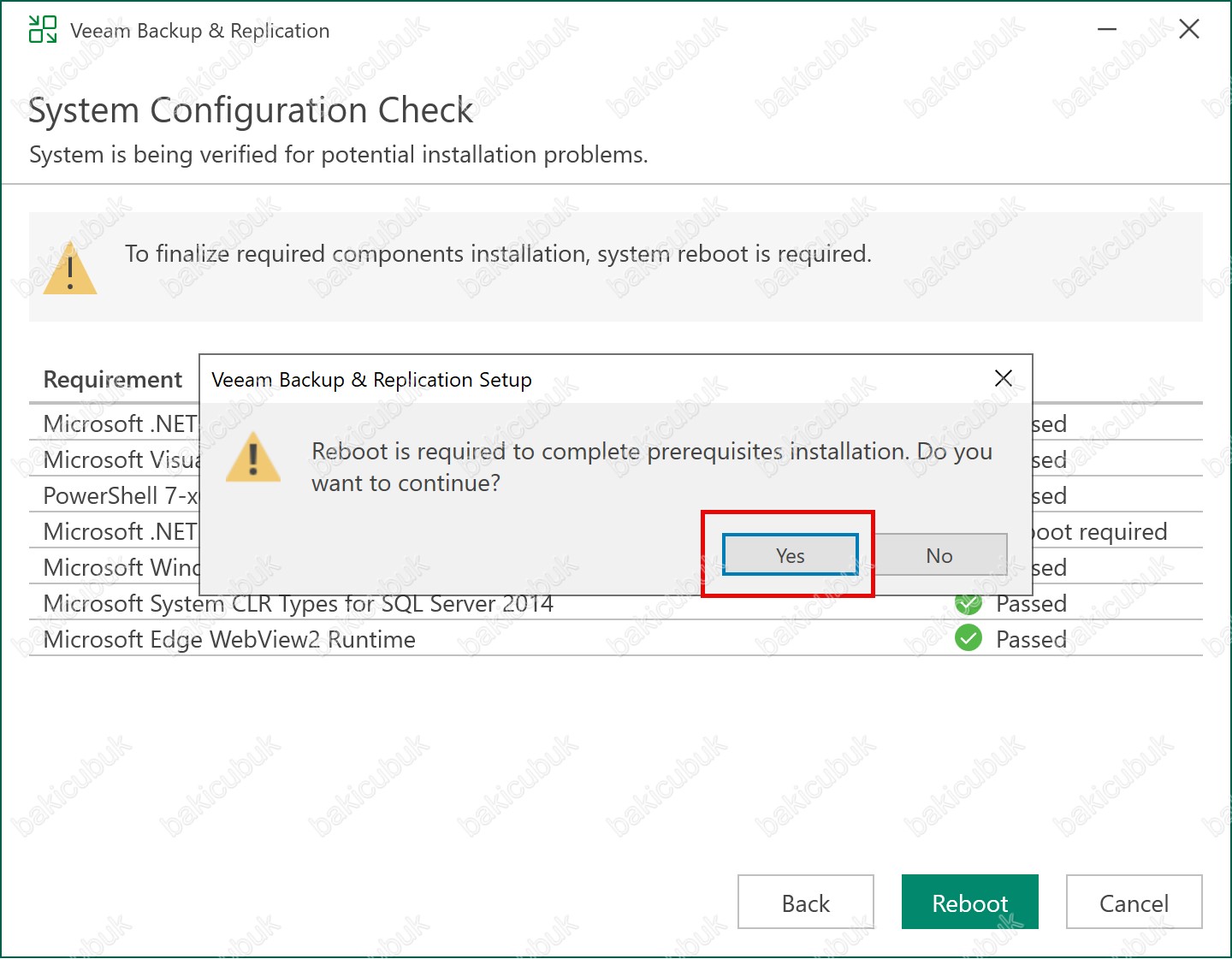Veeam Backup & Replication Setup ekranında Yes seçeneği ile sunucumuzun yeniden başlatarak sonrasında Veeam Backup & Replication 13.0.1.1071 yükseltme işlemine devam ediyoruz.