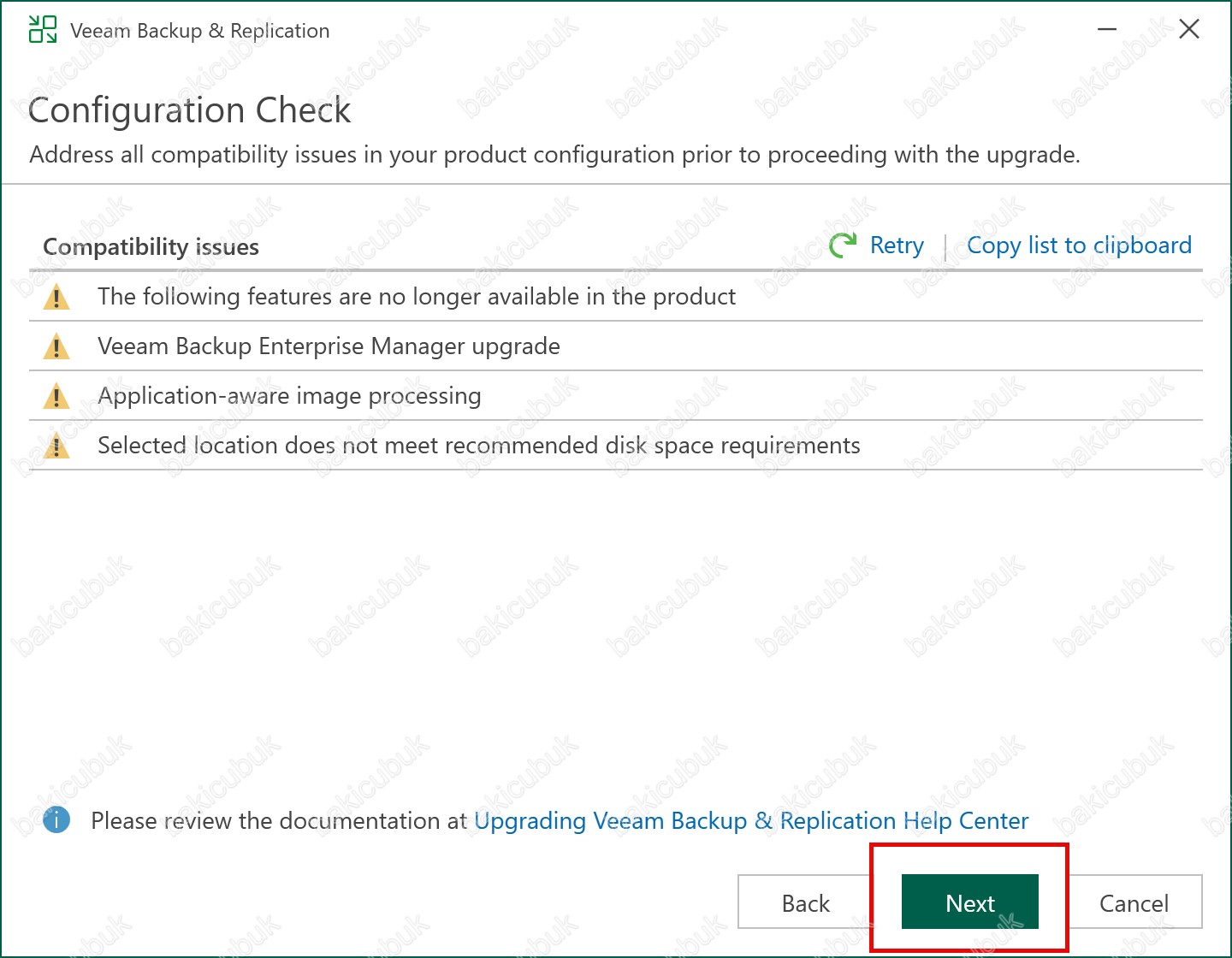 Configuration Check ekranında gerekli kontrolleri yaptıktan sonra Next seçeneği tıklayarak Veeam Backup & Replication 13.0.1.1071 yükseltme işlemine devam ediyoruz.