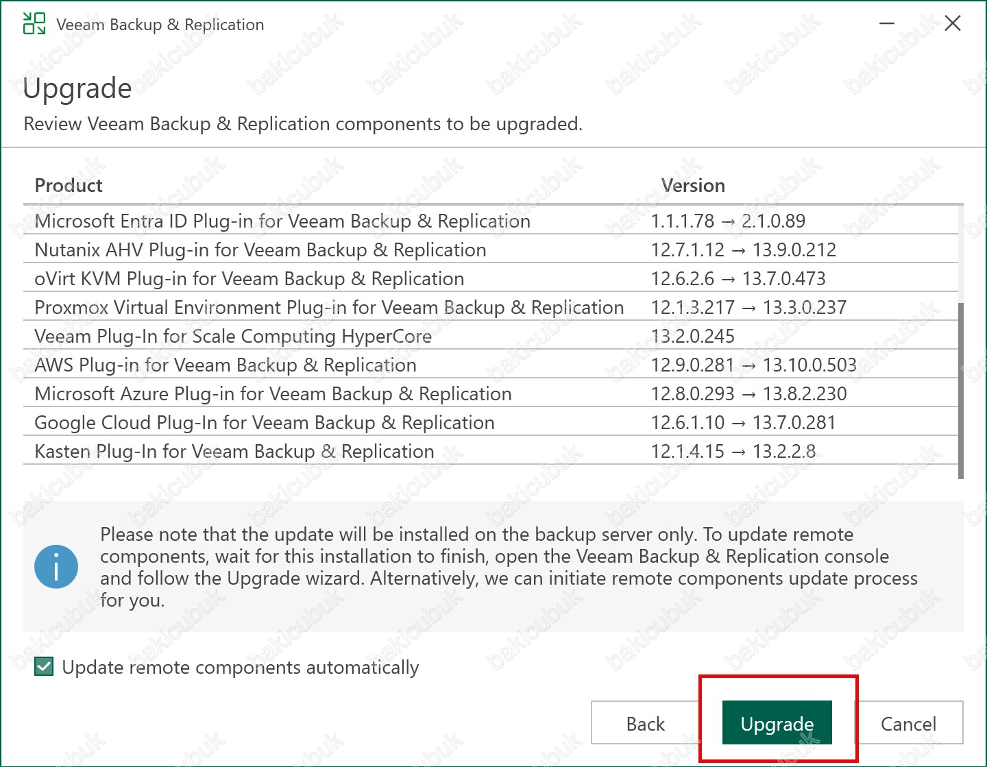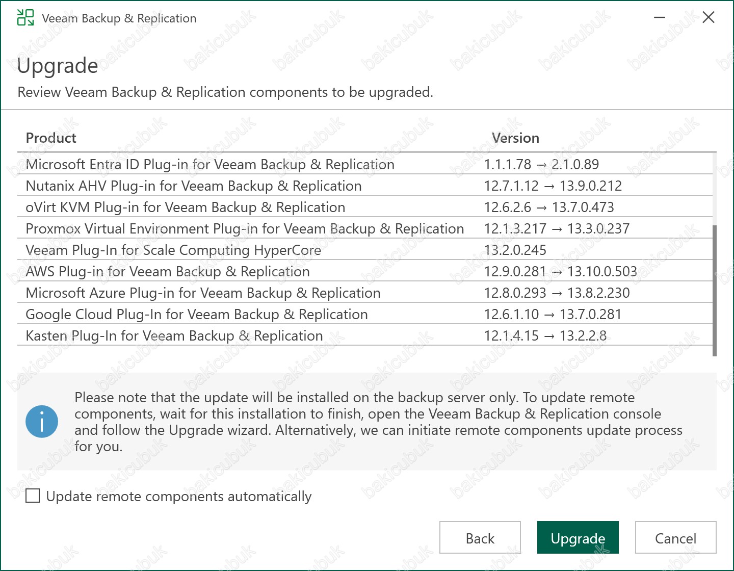Update remote components automatically seçeneği ile Veeam Backup & Replication Server bileşeninin yükseltme işlemi tamamlandıktan sonra uzak bileşenlerin de yükseltme işleminin otomatik olarak yapılması için Update remote components automatically seçeneğini seçebilirsiniz.