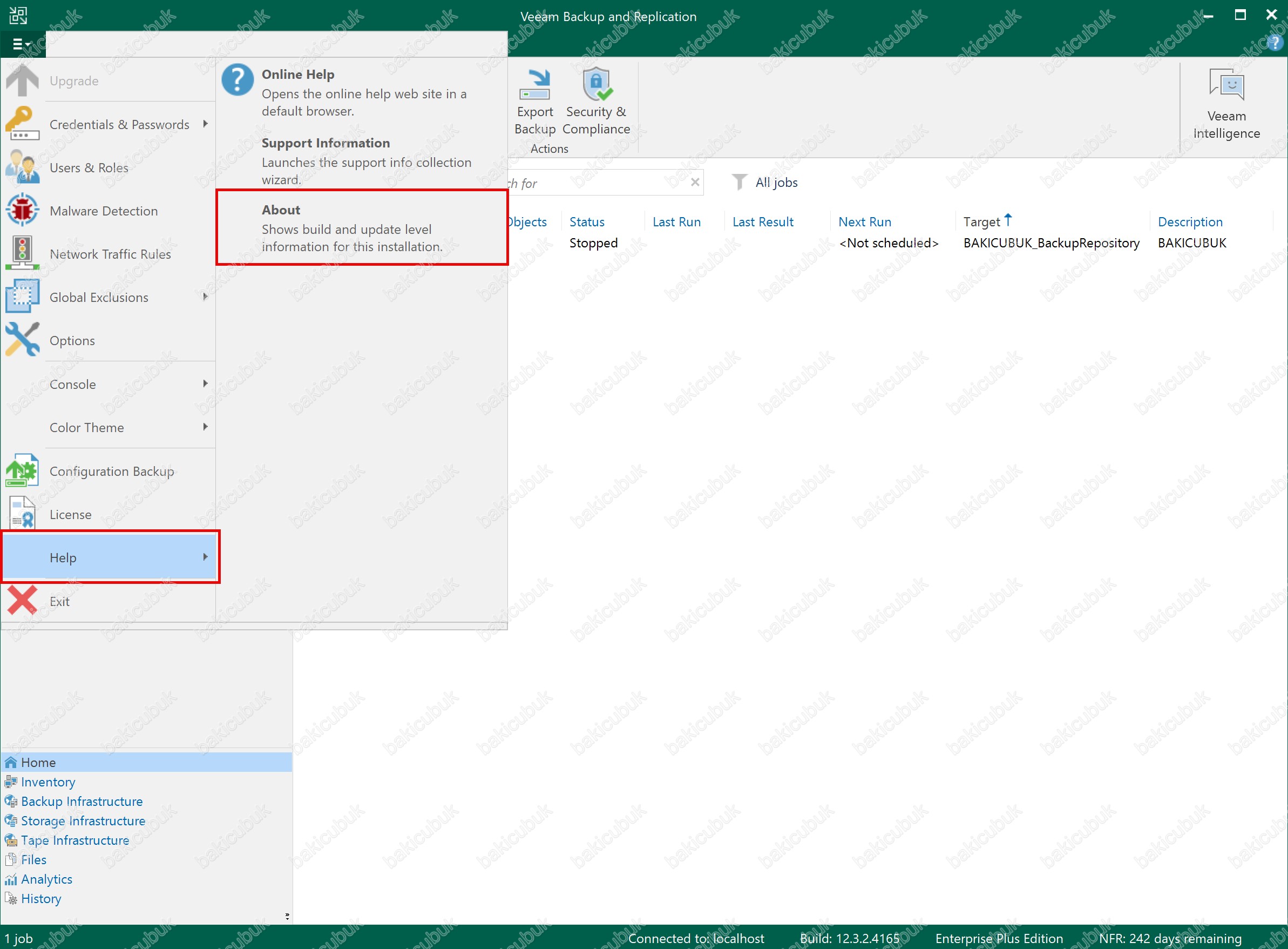 Veeam Backup & Replication 12.3 konsolunda sol üst bölümde bulunan yapılandırma menüsünden Help menüsü altında bulunan About seçeneğine tıklıyoruz ve Veeam Backup & Replication 12.3 versiyonu kontrol ediyoruz.