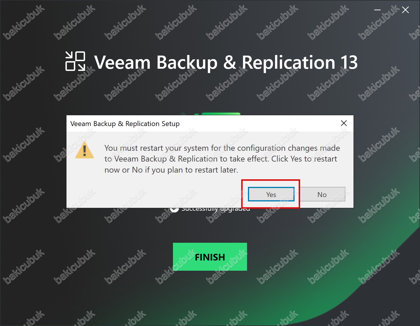 Veeam Backup & Replication Setup ekranında Yes seçeneği tıklanarak sunucu yeniden başlatılır ve yükseltme işlemi güvenli ve eksiksiz şekilde tamamlanmış olur.
