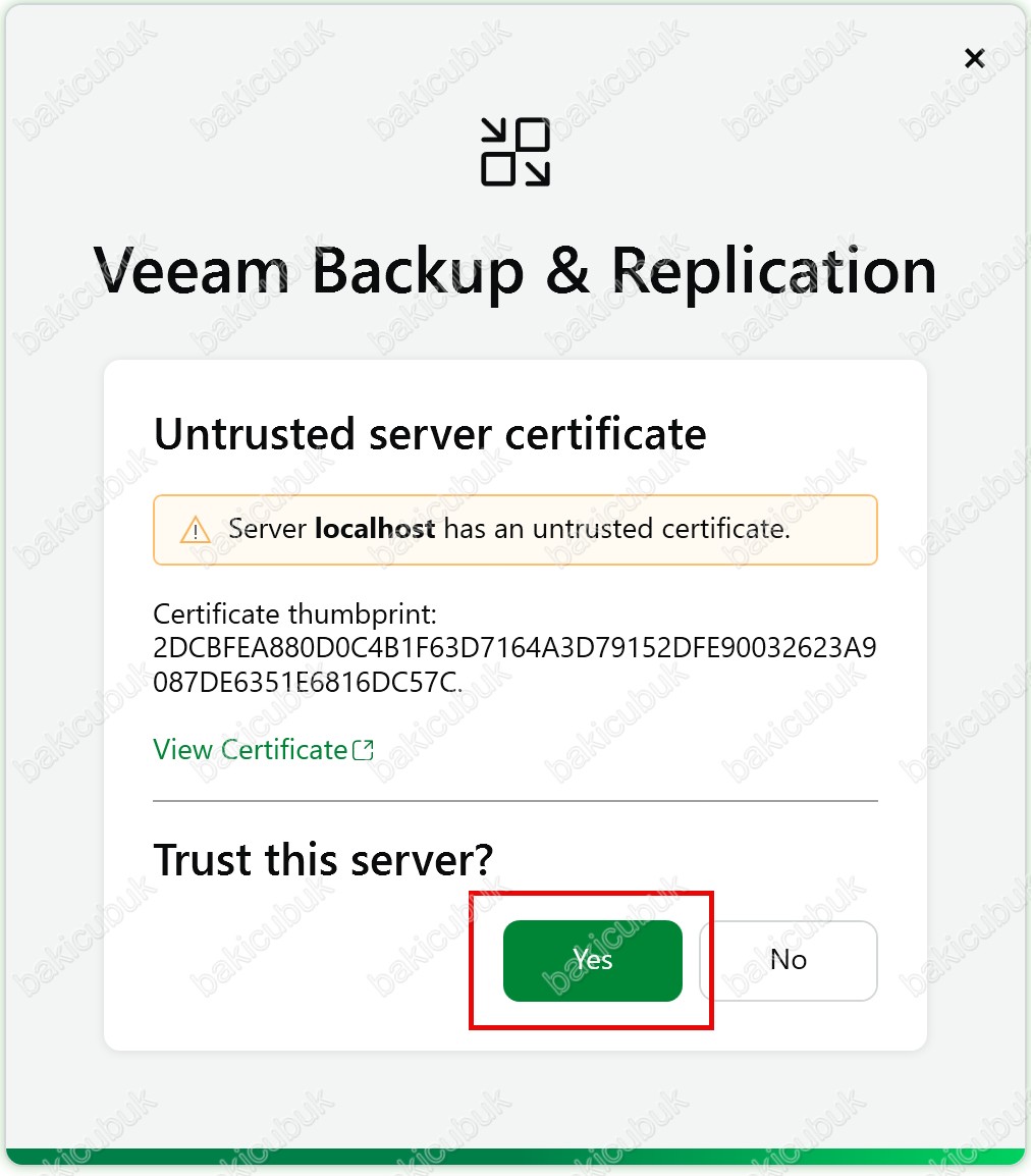 Veeam Backup & Replication ekranında Server certificate bölümünde bağlanmak istediğimiz Veeam Backup & Replication 13.0.1.1071 sunucumuzun sertifikasını Yes diyerek güvenilir olarak kabul ediyoruz ve bağlantı sağlamak için devam ediyoruz.