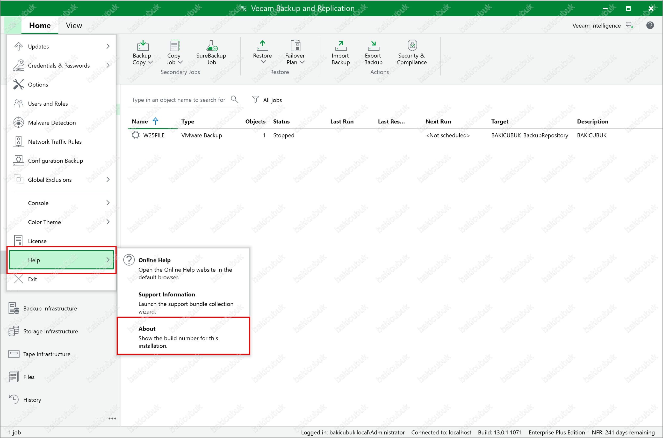 Veeam Backup & Replication 13.0.1.1071 konsolunda sol üst bölümde bulunan yapılandırma menüsünden Help menüsü altında bulunan About seçeneğine tıklıyoruz ve Veeam Backup & Replication 13.0.1.1071 versiyonu kontrol ediyoruz.
