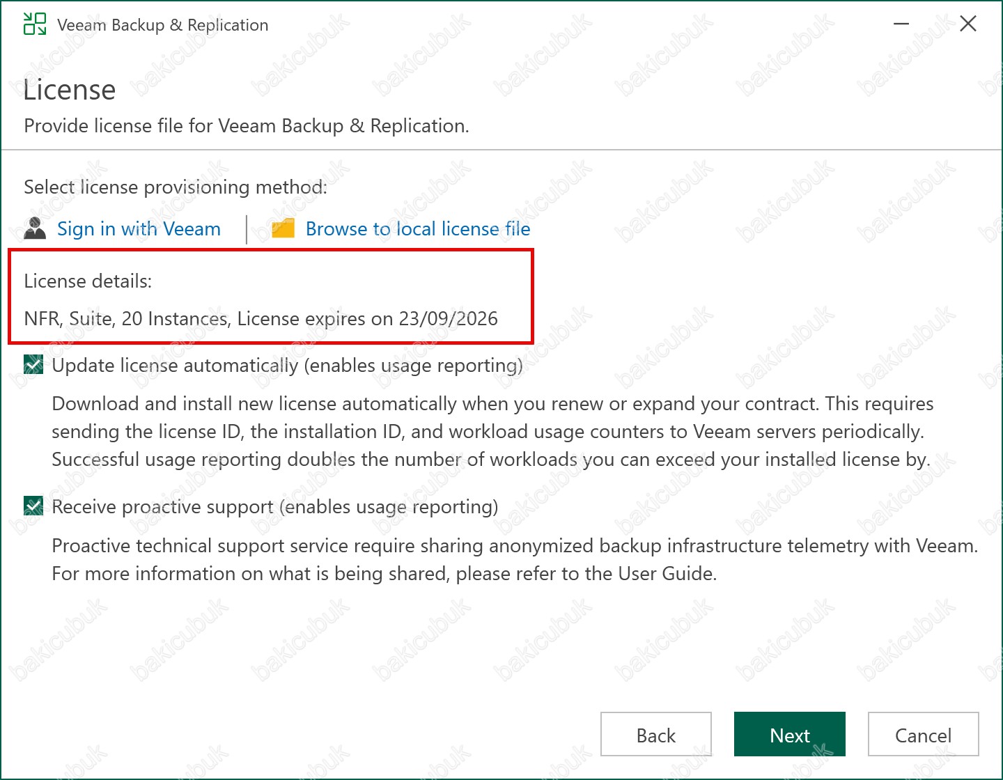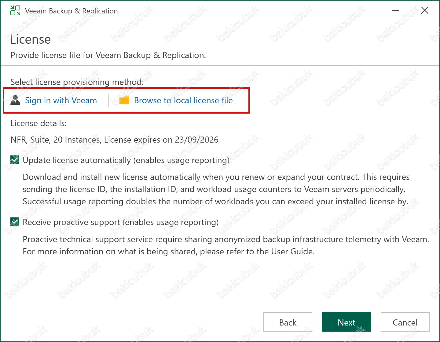 License ekranında Veeam Backup & Replication 12.1 versiyonu ile birlikte Select license provisioning method bölümünü karşımıza gelmişti.