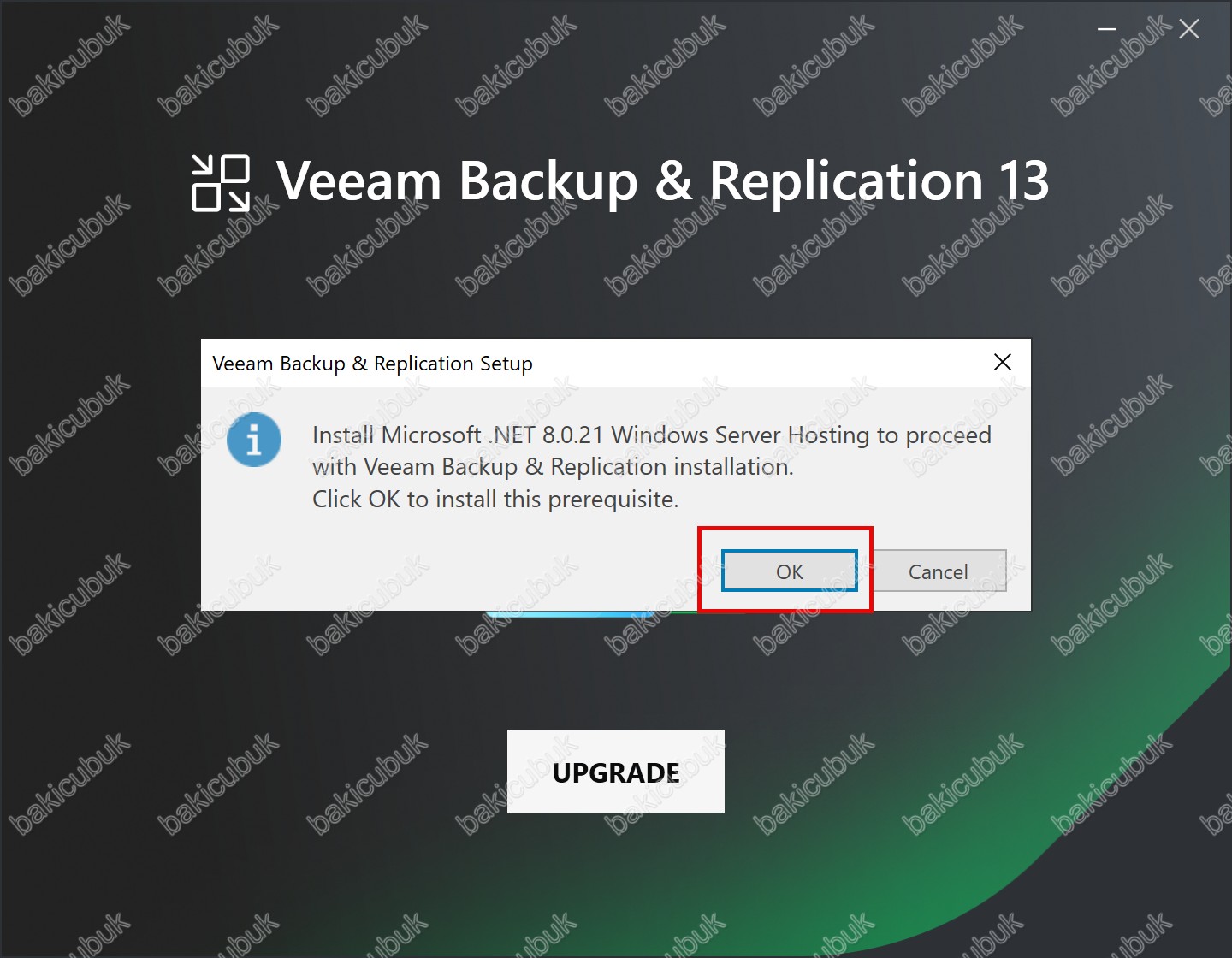 Veeam Backup & Replication Setup ekranında Veeam Backup & Replication 13.0.1.1071 yükseltme işlemi devam edebilmek için sunucumuz üzerine Microsoft .NET 8.0.21 Windows Server Hosting kurulmalıdır. Bu önkoşulu yüklemek için OK seçeneğine tıklayarak devam ediyoruz.