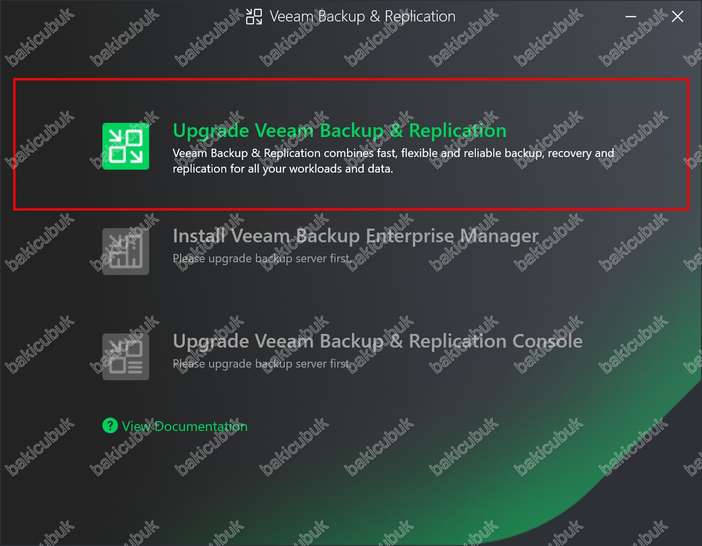 - Upgrade Veeam Backup & Replication: Bu seçenek ile Veeam Backup & Replication 13.0.1.1071 yükseltme işlemini başlatabilirsiniz. Ancak ortamınızda başka bir sunucu üzerinde Veeam Backup Enterprise Manager 13 kurulumunu yaparak yapılandırmışsanız. Ortamınızda öncelikli olarak Veeam Backup Enterprise Manager 13 sunucumuz üzerinde yükseltme işlemini yapmanız gerekmektedir. Eğer ortamınızda başka bir sunucu Veeam Backup Enterprise Manager 13 kurulumunu yapmamışsanız ve yapılandırmadıysanız direkt olarak Veeam Backup & Replication 13.0.1.1071 yükseltme işlemini başlatabilirsiniz.