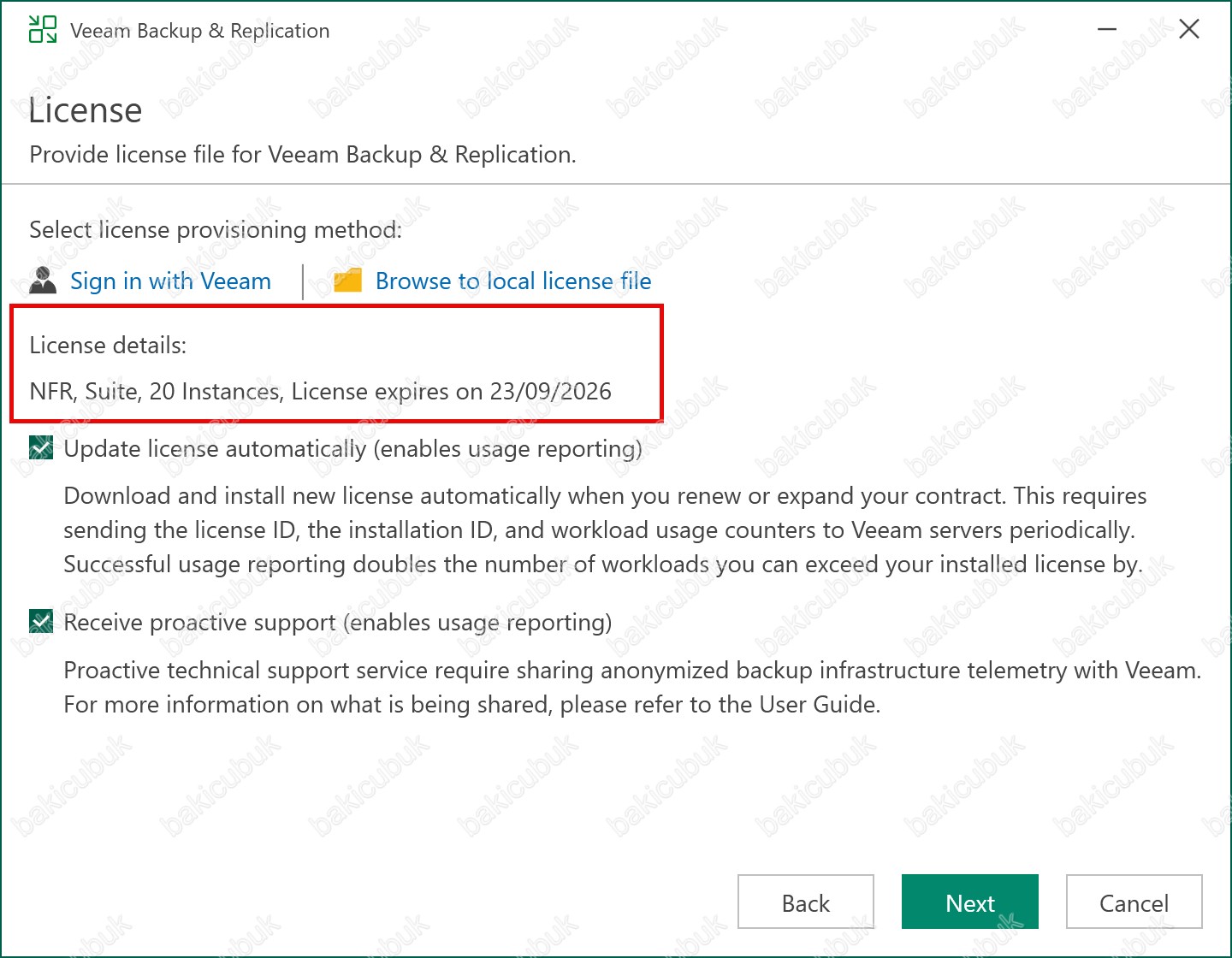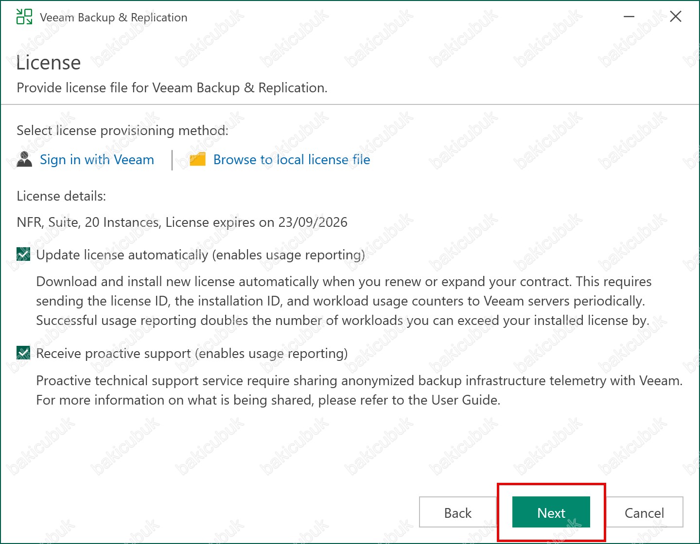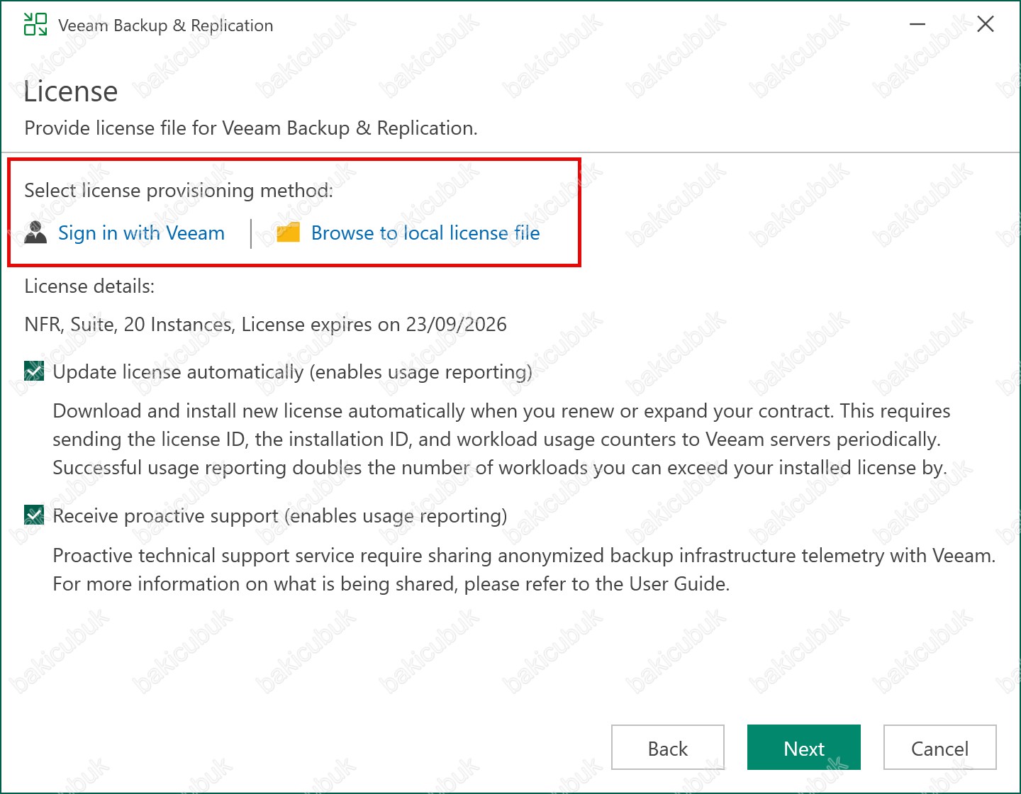 License ekranında Veeam Backup & Replication 12.1 versiyonu ile birlikte Select license provisioning method bölümünü karşımıza gelmişti.