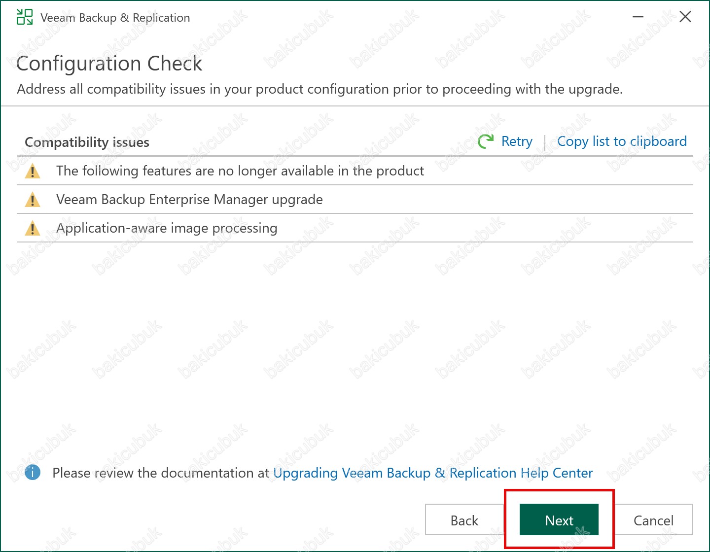 Configuration Check ekranında gerekli kontrolleri yaptıktan sonra Next seçeneği tıklayarak Veeam Backup & Replication 13.0.1.180 yükseltme işlemine devam ediyoruz.