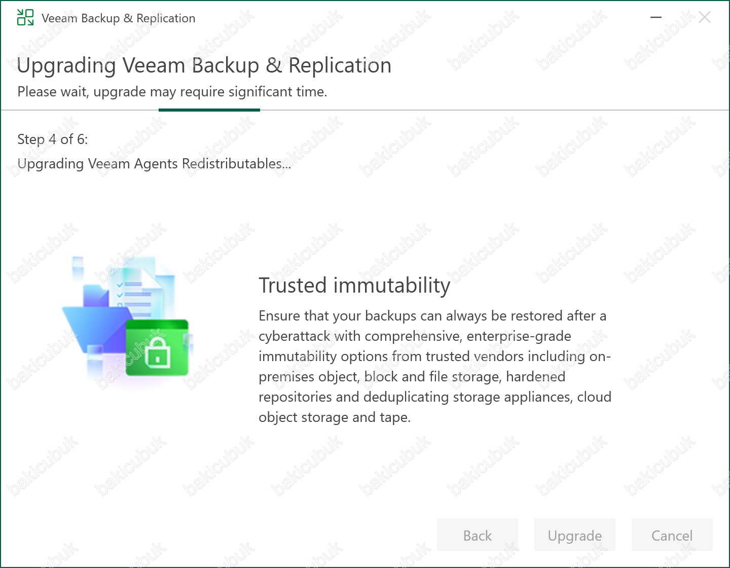 Upgrade seçeneğine tıklıyoruz ve Veeam Backup & Replication 13.0.1.180 yükseltme işlemini başlatıyoruz.