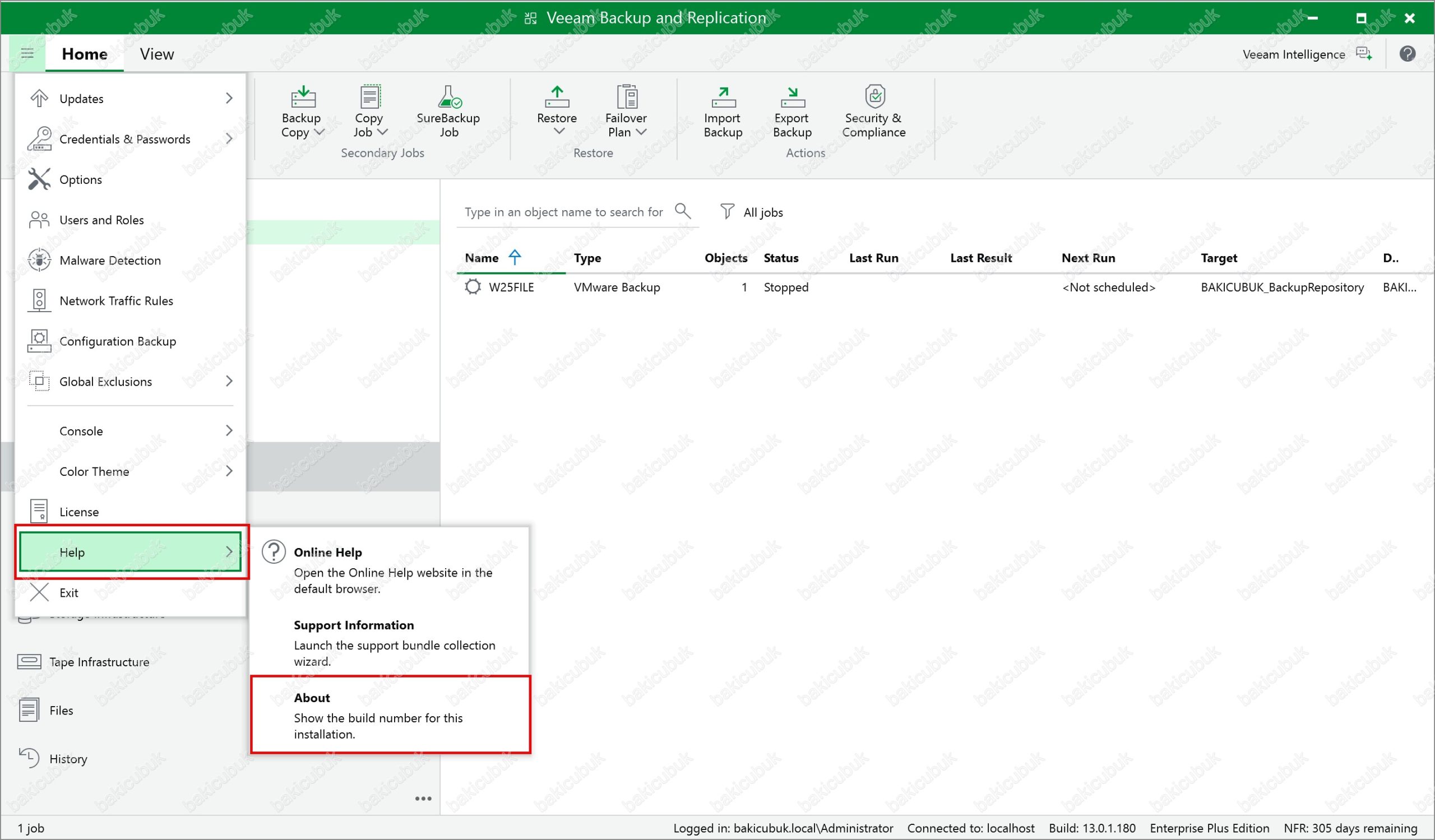 Veeam Backup & Replication 13.0.1.180 konsolunda sol üst bölümde bulunan yapılandırma menüsünden Help menüsü altında bulunan About seçeneğine tıklıyoruz ve Veeam Backup & Replication 13.0.1.180 versiyonu kontrol ediyoruz.
