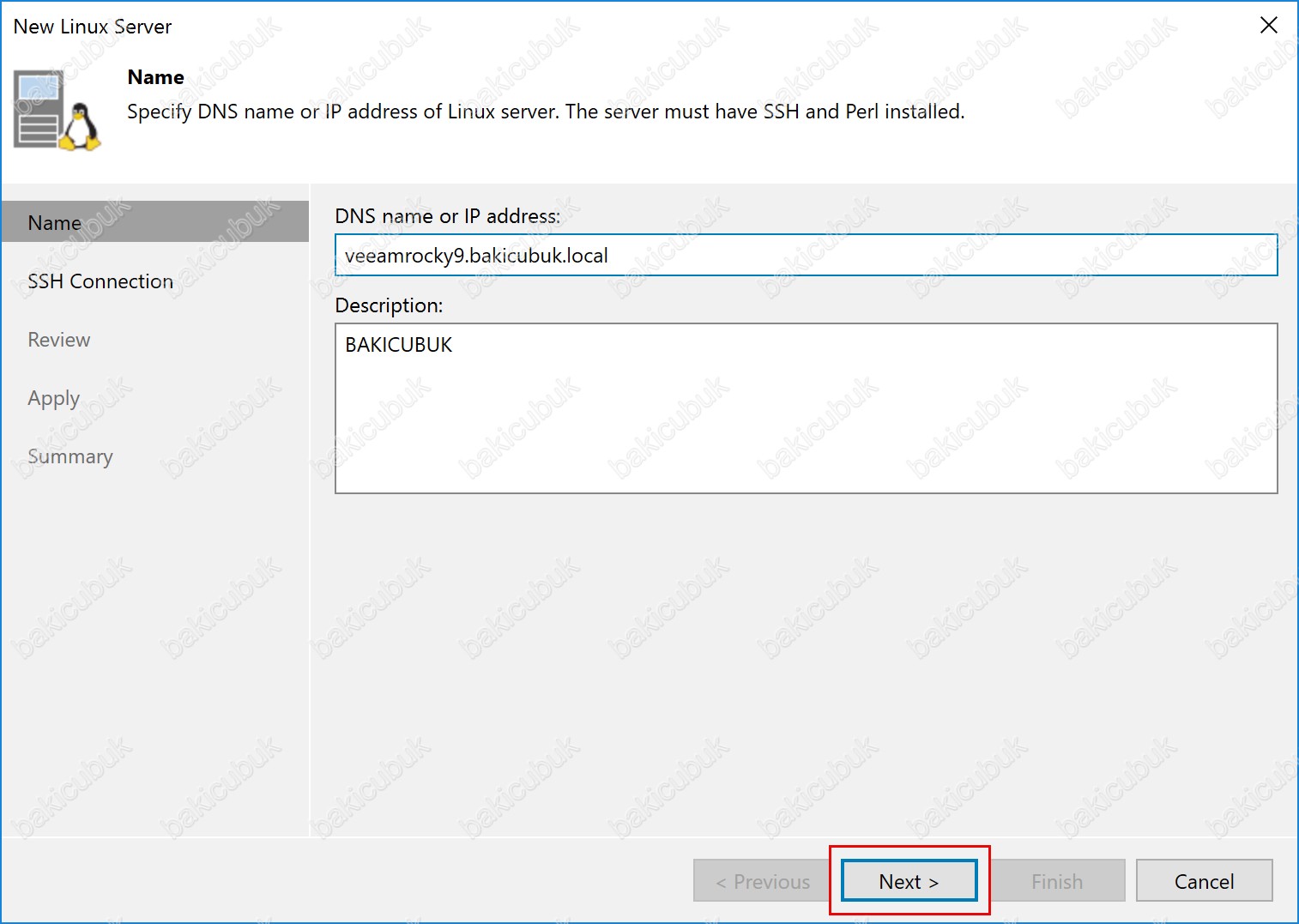 Name ekranında DNS name or IP address bölümüne Veeam Backup & Replication 12.3 üzerine ekleyeceğimiz Rocky Linux 9.5 sunucumuzun DNS Name ( Domain Name Server İsmi ) ya da IP address ( IP Adresi ) bilgisini yazıyoruz.