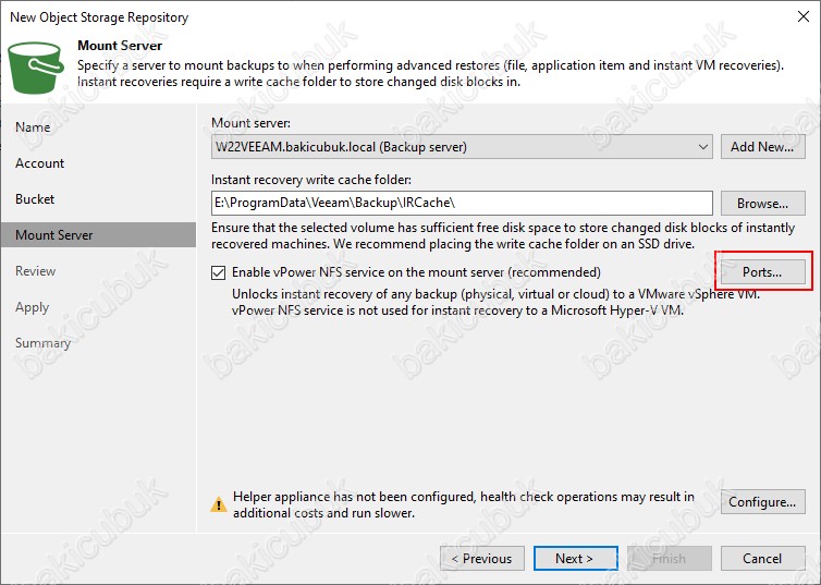 Enable vPower NFS service on the mount server (recommended) bölümün de bulunan Ports seçeneğine tıklıyoruz.