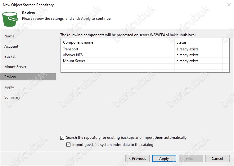 Review ekranın da Search the repository for existing backups and import them automatically seçeneği işaretlerseniz yapılandıracağınız Backup Repository içinde eğer daha önceden alınan Backup ( Yedek ) dosyalarını Import guest file system index data to the catoalog seçeneğini seçerek Import edecektir. Ancak Veeam Backup & Replication 12 kurulumu sonrasından yeni bir Backup Repository yapılandırdığımız için bu seçeneği işaretlemenize gerek yoktur.
