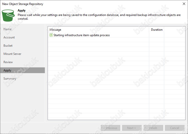 Apply ekranın da Veeam Backup & Replication 12 üzerinde Amazon Cloud Storage yapısını Backup Repository olarak yapılandırma işleminin başladığını görüyoruz.