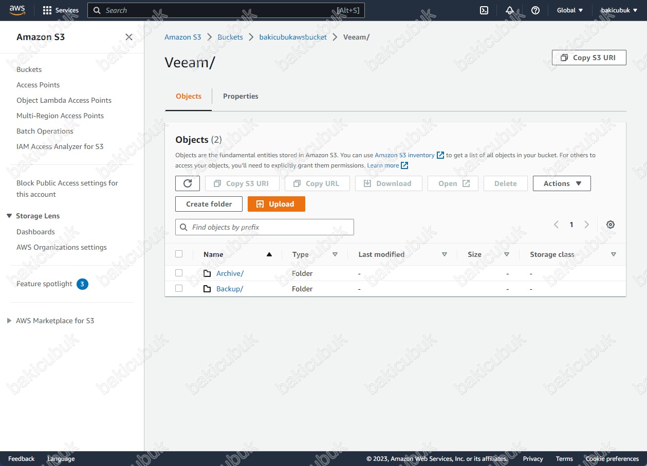 Bucket ekranın da Folder bölümüne yeni oluşturduğumuz bakicubukveeam isimli Folder ( Klasör ) geldiğini görüyoruz.