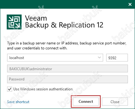 Veeam Backup & Replication 12 konsolunu Connect diyerek açıyoruz.