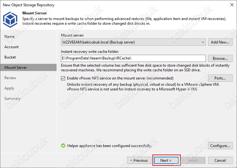 Enable vPower NFS service on the mount server (recommended) seçeneğin de ise Veeam firmasına patentli bir teknolojisi olan vPower NFS özelliğini aktif edebiliyoruz.