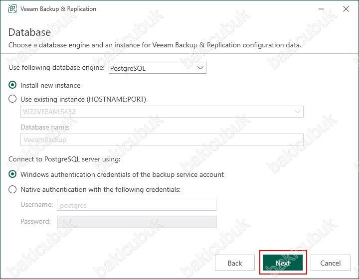 Install new instance seçeneği ile PostgreSQL 15.1 kurulumunu Veeam Backup & Replication 12 kurulumunu yapacağımız Windows Server işletim sistemine sahip sunucunuz üzerinde kurulmasını sağlıyoruz..