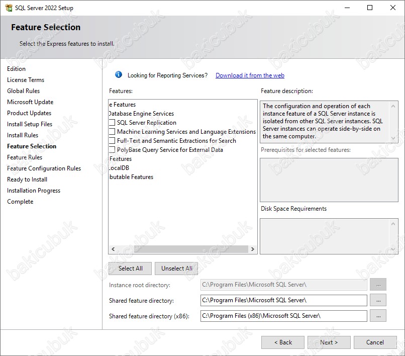 Feature Selection ekranın da Microsoft SQL Server 2022 Express kurulumu için hangi servislerinin ve özelliklerinin kurulacağını yapılandırdığımız ekrandır. Microsoft SQL Server 2022 Express kurulumu için seçilmesi gereken önemli servis Database Engine Services servisidir. Geri kalan servisler ve özellikler Microsoft SQL Server 2022 Express hangi uygulama için kullanılacağına bağlı olarak seçilmektedir.
