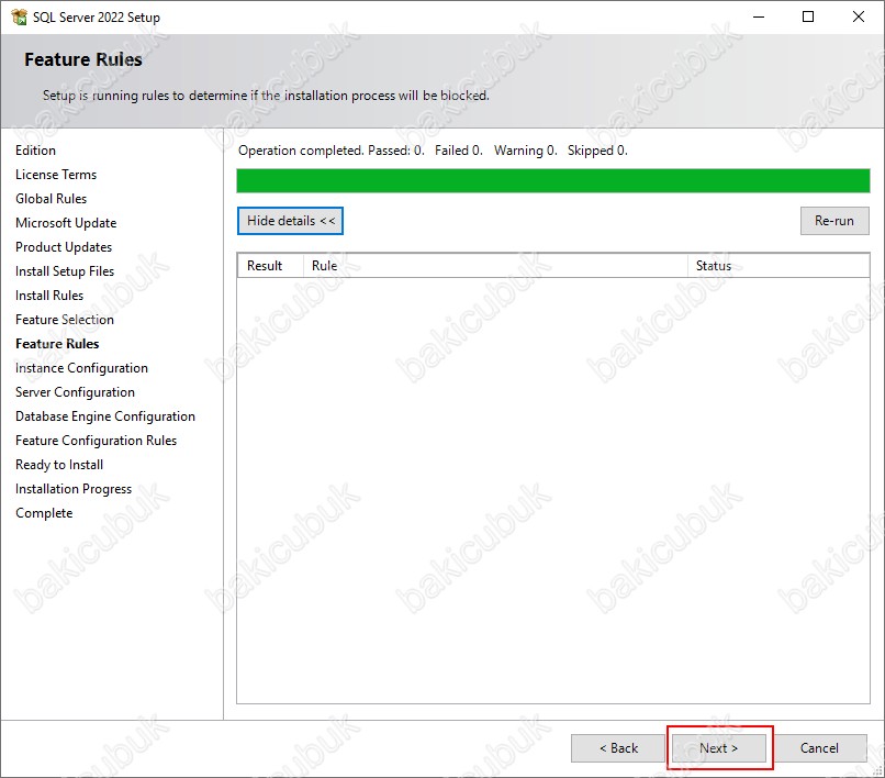 Feature Rules ekranın da Microsoft SQL Server 2022 Express kurulumu için gerekli olan yapılandırmada herhangi bir eksik olup olmadığını kontrol ediliyor. Microsoft SQL Server 2022 Express kurulumu ve yapılandırması için önemli bir hata olmadığından Microsoft SQL Server 2022 Express kurulumu için Next diyerek devam ediyoruz.