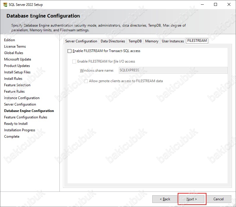 Database Engine Configuration ekranın da User instance sekmesinde gerekli yapılandırmayı tamamladıktan sonra FILESTREAM sekmesine geçiyoruz.
