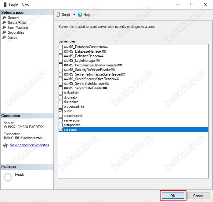 - securityadmin (Security Administrator – Güvenlik Yöneticisi) : Server üzerinde kullanıcıların yetkilerini denetlemek, yönetmek ve şifrelerini sıfırlamak ya da istendiğinde değiştirme yetkisi olan demektir.