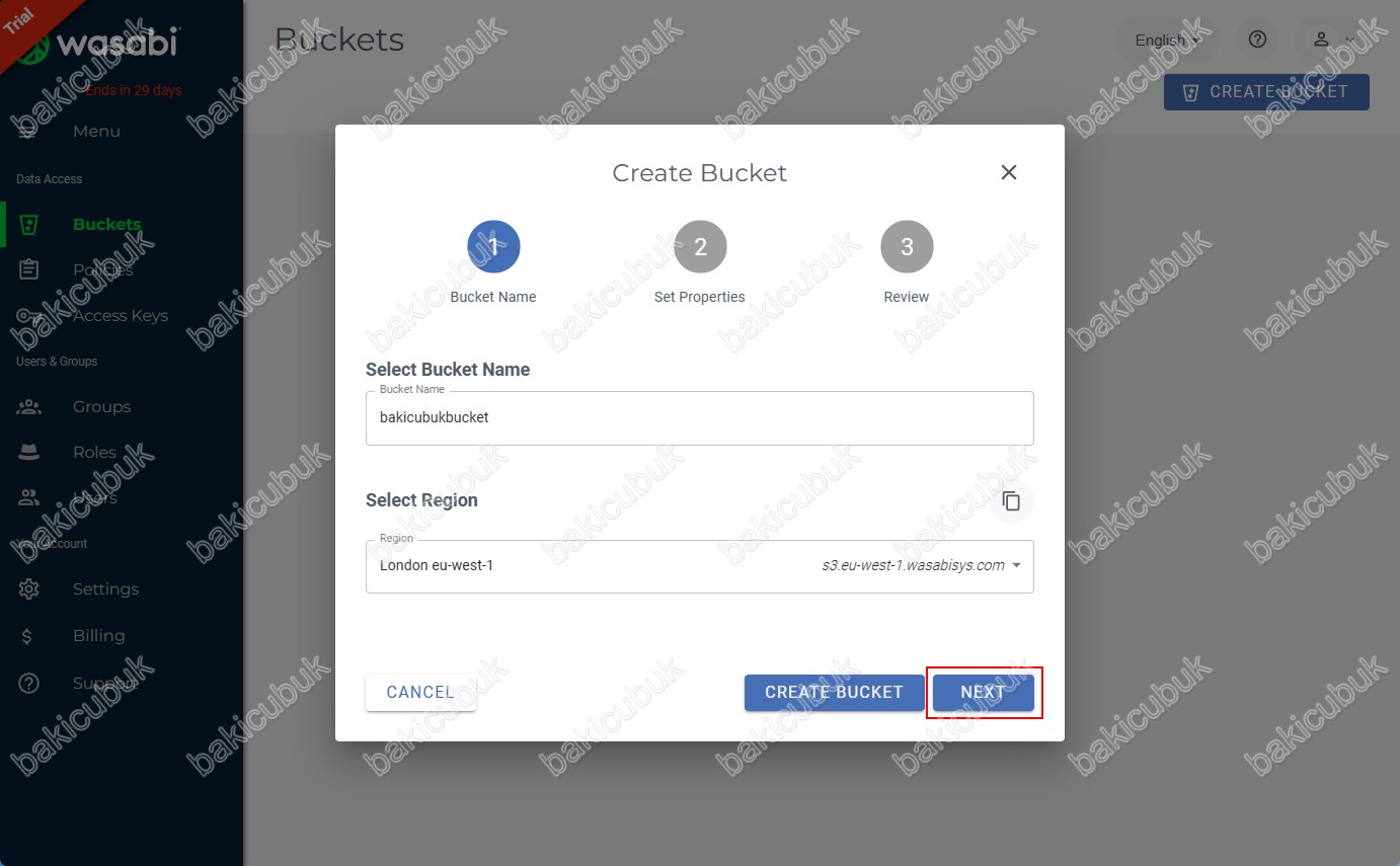 Create Bucket ekranın da Set Properties seçeneğinde gerekli yapılandırmayı tamamladıktan sonra NEXT diyerek devam ediyoruz.